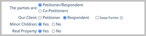 This feature is also useful if your client is Petitioner in one case but Respondent in a related matter or vice versa. In that case, you can copy the case and then use the Swap Parties feature. This will quickly produce the desired result without having to reenter all of your case information in a second case.